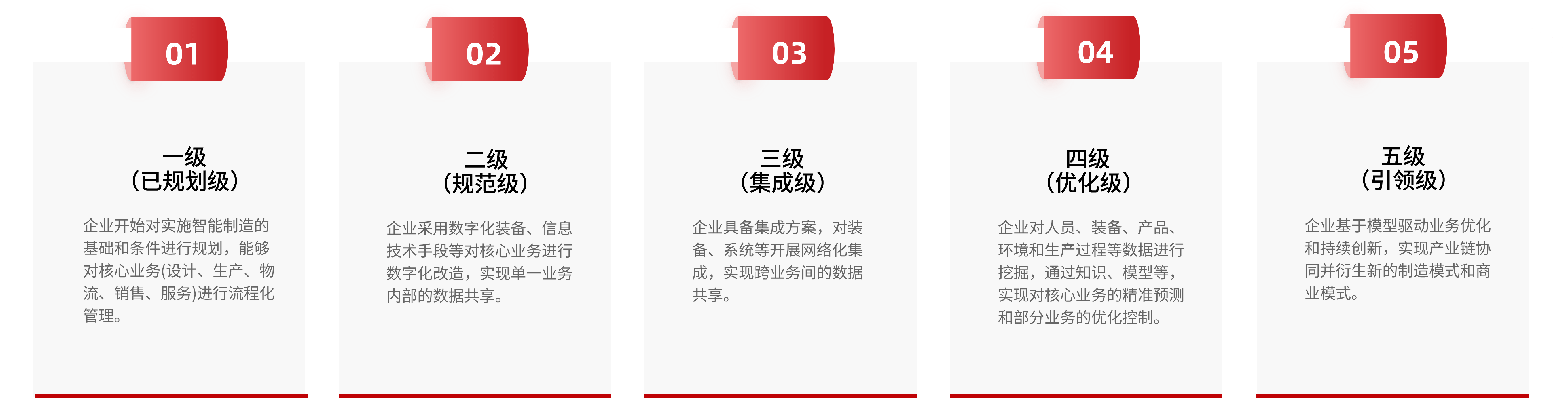根据国家标准,智能制造能力成熟度模型的L1至L5分级标准如下: